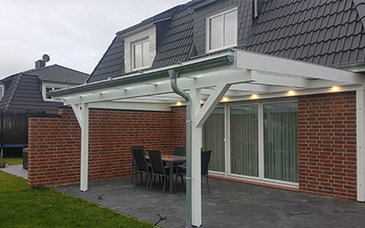 Wir bieten Terrassenüberdachungen aus Holz an, die baulich an Ihr Haus angepasst sind.